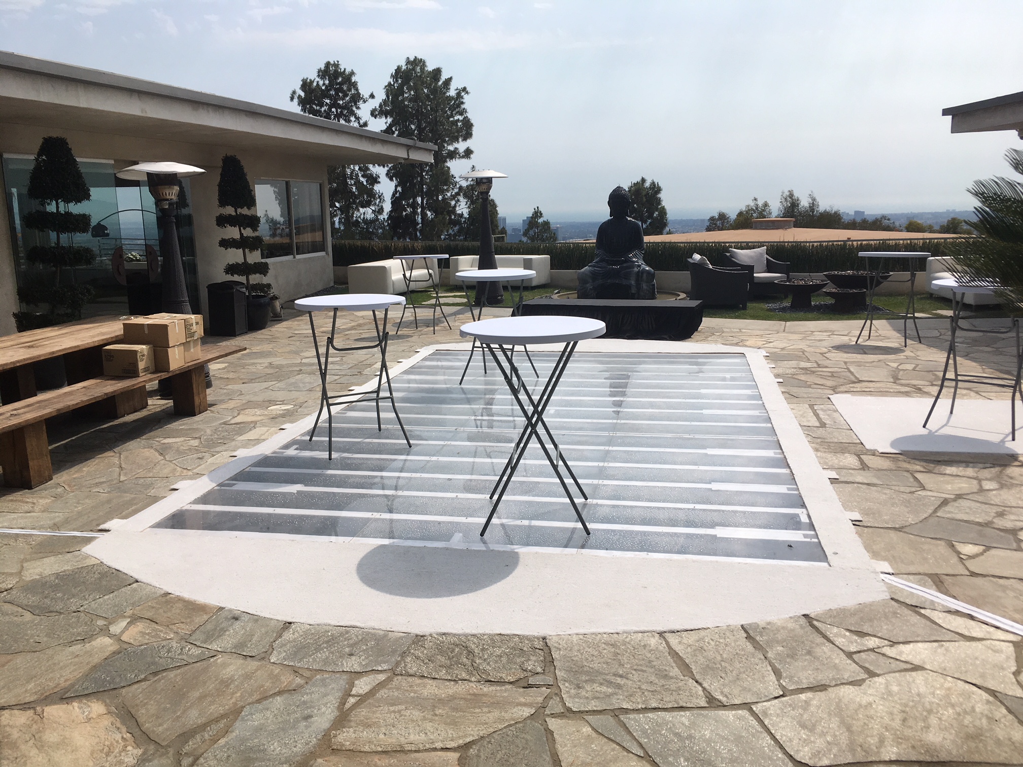 Clear Dance Floor Decking/Staging Over your Swimming Pool _ We can create a Hard Platform that can be used for Dancing——- 818-636-4104